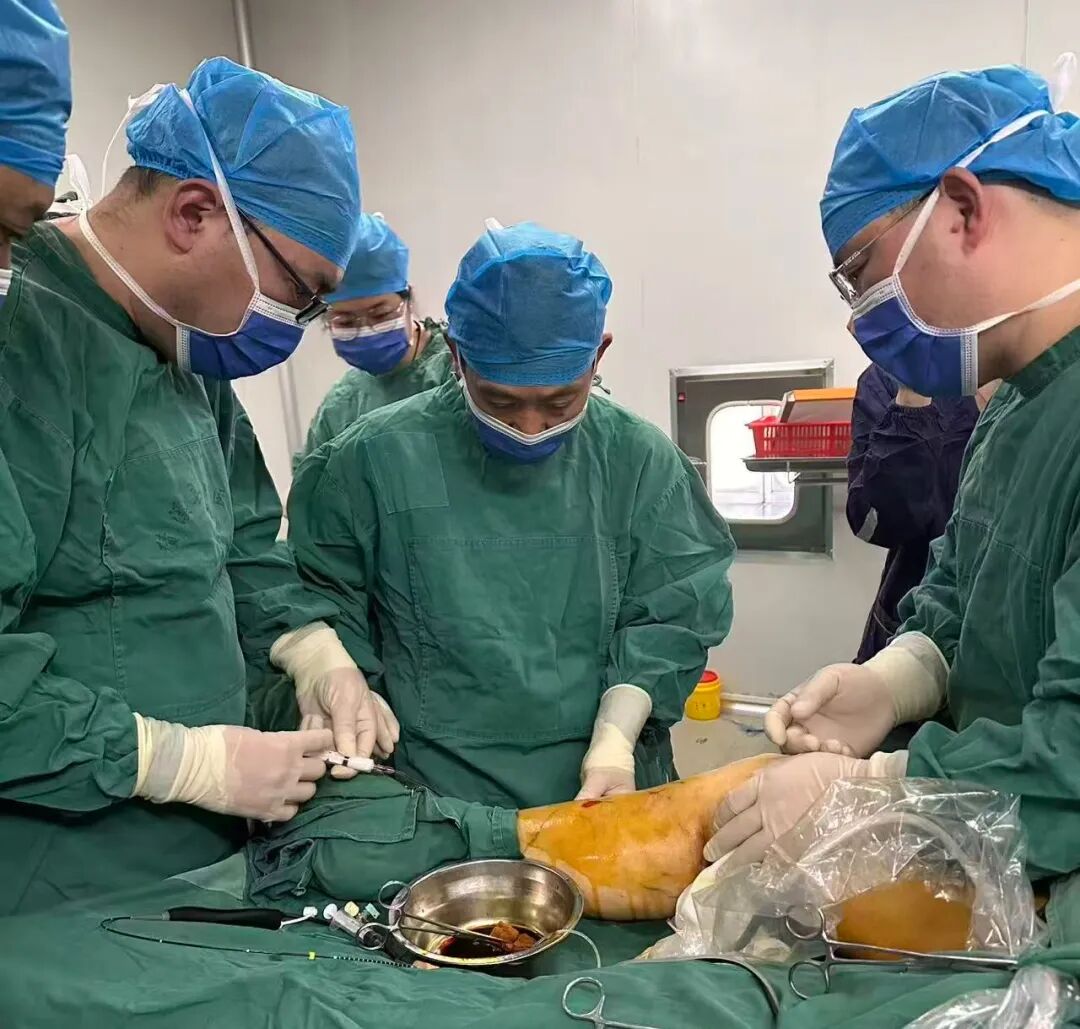 近日,绩溪县中医院外科团队在陈振远名医工作室专家成员江振辉主任的指导下,成功为一位63岁患者施行“右侧大隐静脉射频消融联合点状抽剥及硬化剂注射术”。手术全程在超声精准引导下进行,历时约一小时,术中出血仅5毫升。术后患者下肢曲张静脉得到显著改善,并于次日顺利出院。该案例充分体现了微创技术在老年血管疾病治疗中的安全性与有效性。