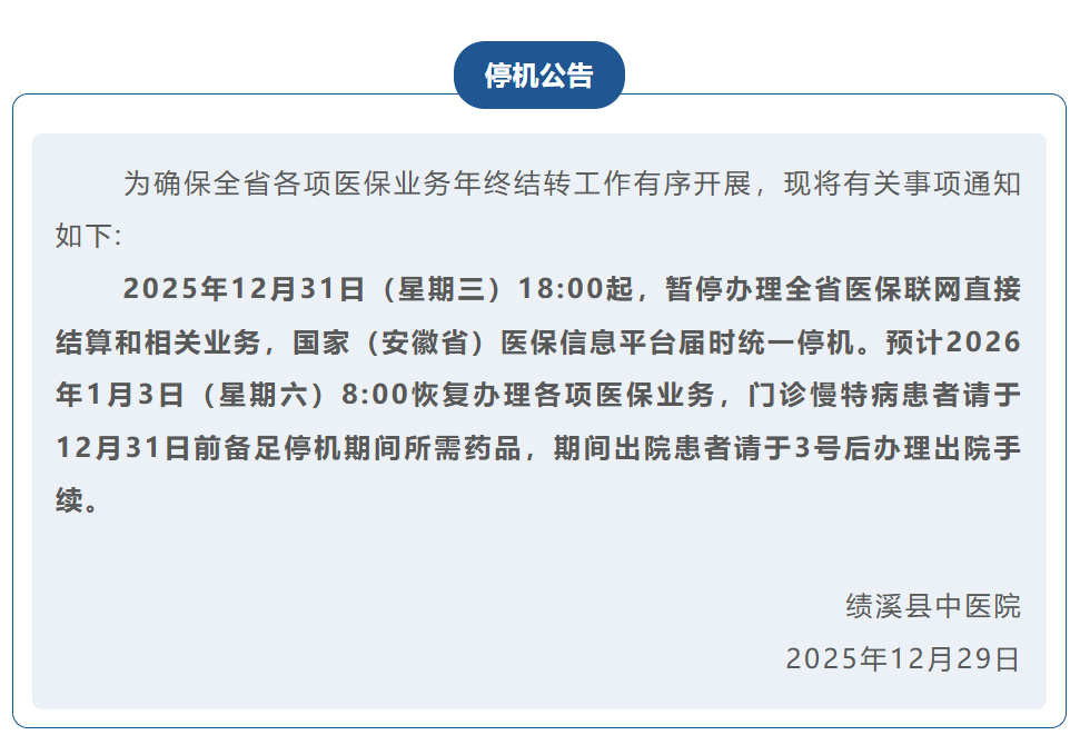 为确保全省各项医保业务年终结转工作有序开展,现将有关事项通知如下: 2025年12月31日(星期三)18:00起,暂停办理全省医保联网直接结算和相关业务,国家(安徽省)医保信息平台届时统一停机。预计2026年1月3日(星期六)8:00恢复办理各项医保业务,门诊慢特病患者请于12月31日前备足停机期间所需药品,期间出院患者请于3号后办理出院手续。